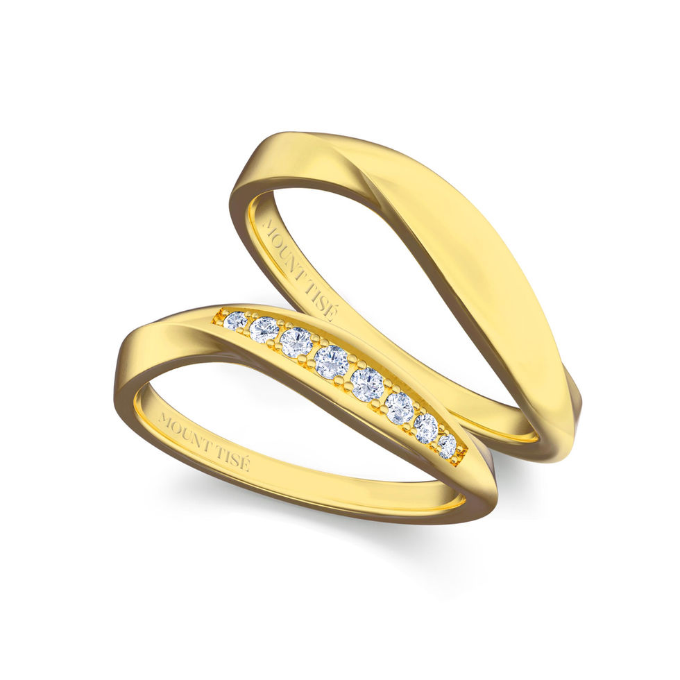 這款對戒以其輕盈的曲線和流暢的設計彰顯了恆久的愛情。男戒的簡潔造型象徵著堅定與力量,而女戒則在同樣優雅的曲線中鑲嵌了一排明亮的鑽石,閃耀著溫柔的光輝,象徵著細膩與關懷。兩者共享柔和的輪廓,宛如兩條人生路徑的平行與交匯,代表著夫妻同行的甜美旅程。