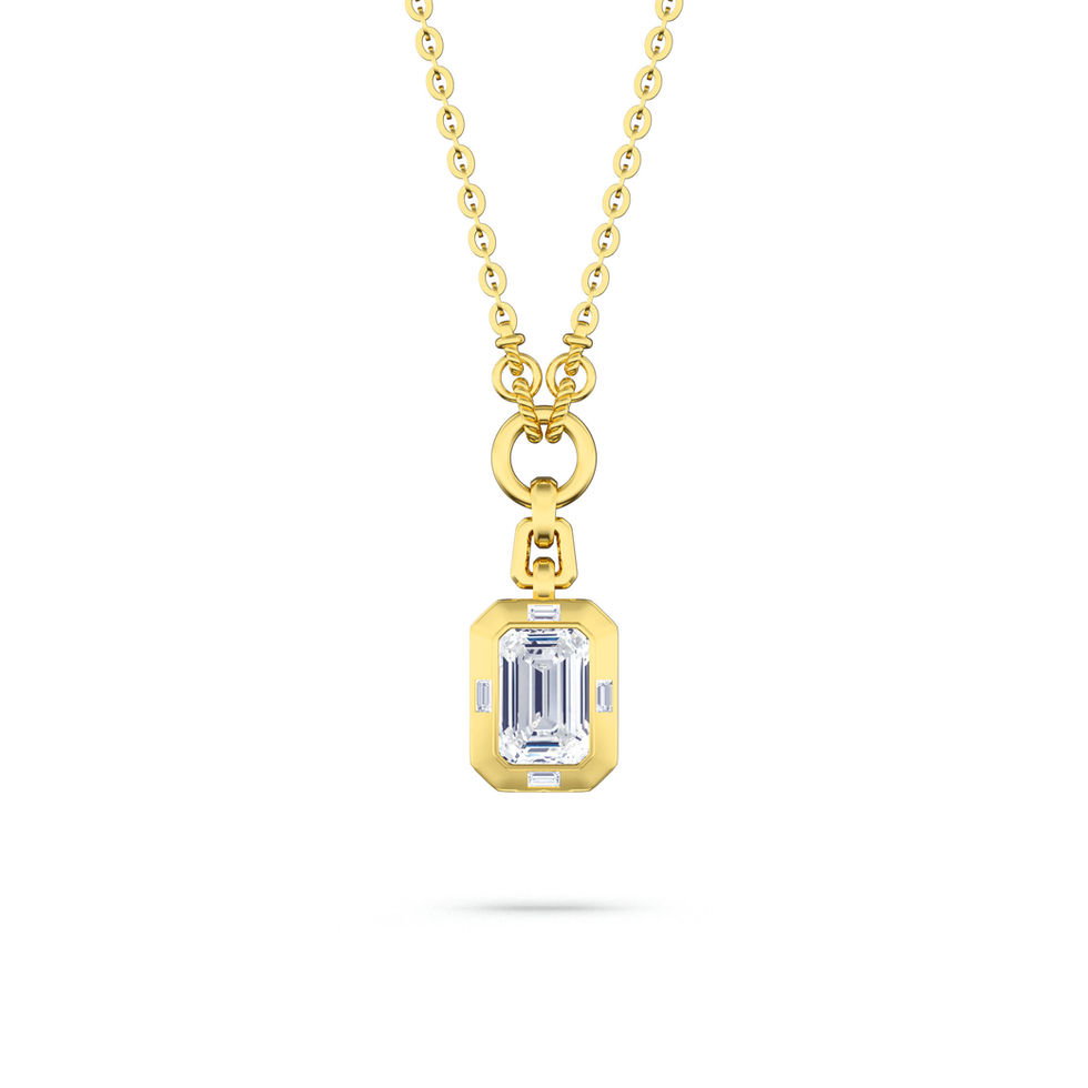 這款吊墜極具現代感且簡潔。吊墜中央鑲嵌著一顆精緻的祖母綠切割鑽石,為這件作品增添了一抹優雅和貴氣。祖母綠切割的直線和清晰的輪廓突出了鑽石的閃耀,同時也呼應了吊墜的幾何設計風格。這款吊墜的設計簡潔而不失精巧,它代表了一種純粹的美學觀點,既適合追求時尚前衛的年輕消費者,也適合優雅高貴的成熟女性。這款吊墜無疑將成為珠寶盒中的一顆耀眼明珠。