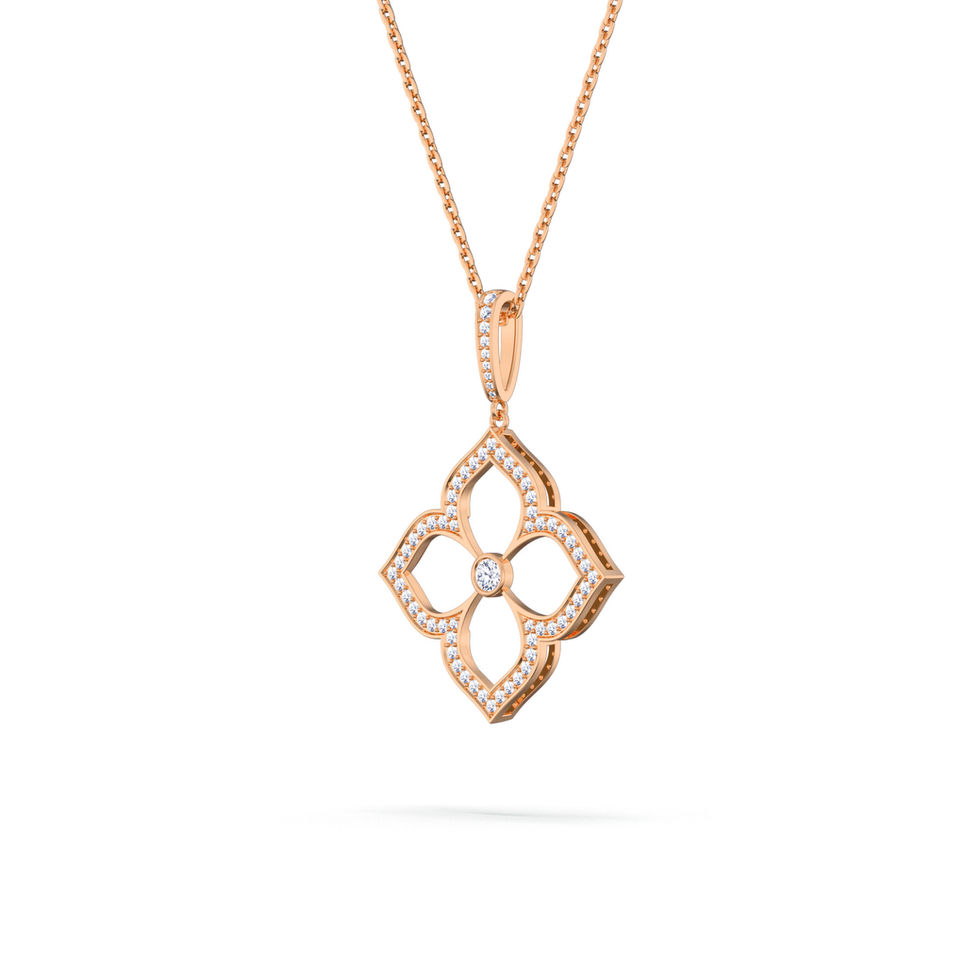 這款吊墜的設計融合了復古風格與現代美學,締造出一件獨特的飾品。吊墜的設計呈現一朵四瓣花的形態,每一瓣花邊緣細緻地鑲滿了閃耀的小鑽,中心則是一顆較大的圓形鑽石,宛如花蕊中的露珠,散發著微妙而迷人的光芒。這種設計不僅象徵著自然之美,也代表了愛情的美好與純淨。它不僅是一件珠寶,更是一種表達情感的藝術品,能夠代代相傳,見證愛情的永恆。