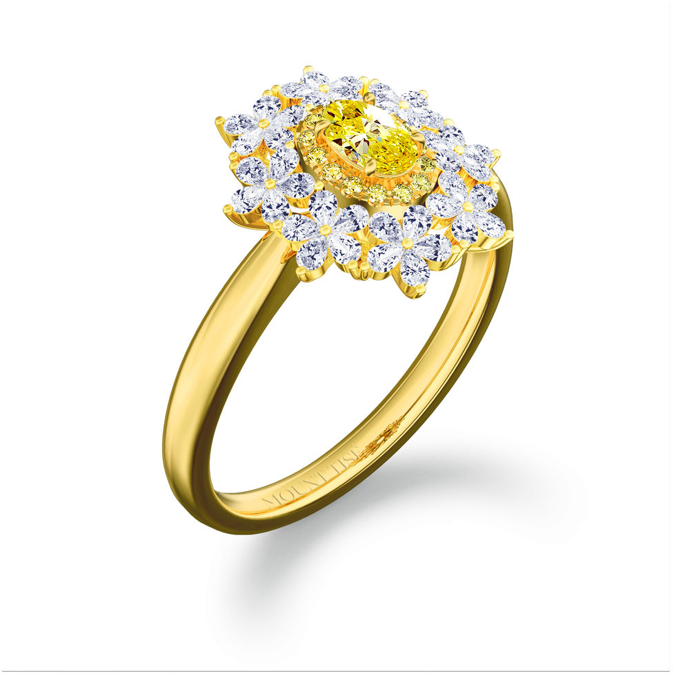 這款求婚鑽戒的設計相當華麗且富有創意,中心主鑽為一顆橢圓鴿子蛋黃鑽,其色澤飽和而熱烈。這顆黃色主石被兩層鑽石環繞,內層為較小的圓形明亮切割黃鑽,緊緊包圍住中心鑽石,而外層則由較大的梨形白鑽組成,排列得宛如花瓣,共同形成了一個花朵圖案。這種鑲嵌方式不僅增強了整個戒指的立體感和動感,也讓主石顯得更加突出和閃耀。