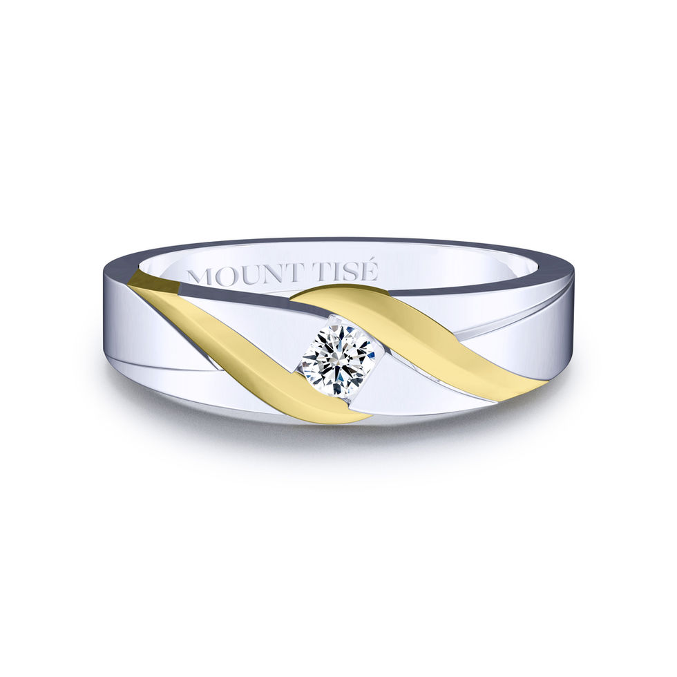 這款男戒以其大膽而現代的設計突破傳統,融合典雅的白金與溫潤的黃金,彰顯出穩重與奢華的風格。中央使用特殊夾鑲工藝鑲嵌的鑽石猶如一顆星辰,寓意著持戒者內心的堅定與光輝。流暢的金屬線條與對比色調的搭配,象徵著現代男性的多面性與深邃思維,完美適合於尋求獨特風格和個性表達的男士。